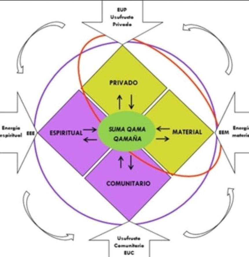 Die jahrtausendealten Aymara-Qhichwa-Ureinwohner (...) sind Teil eines komplexen Gefüges und Flusses von Gesprächen, sowohl durch aktuelle als auch durch imaginäre Präsenzen und Aktivitäten, da die Welt als ein "lebendiges organisches Wesen/Wesen" gesehen wird, das die Koexistenz in AYNI ermöglicht: Beziehungen der Gegenseitigkeit in Gerechtigkeit und Harmonie mit dem Pluriversum der biotischen Welten.