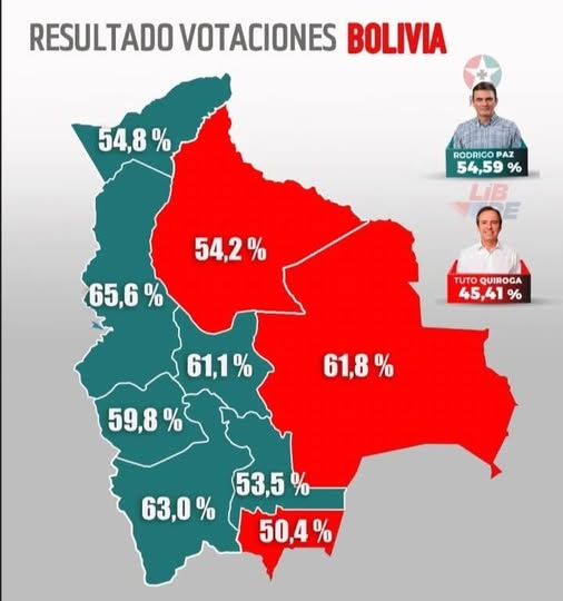 Allí donde viven los de origen andino, amazónico y chaqueño perdió la candidatura de la plutocracia ultrarasista. En La Paz, Oruro, Chuquisaca, Potosí, Cochabamba y Pando, el también ciudadano norteamericano Tuto Quiroga, candidato directo de Trump, perdió. Apenas en tres departamentos (Santa Cruz, Tarija y Beni) se impuso. Los gringos están de todas maneras alegres por que ganó su segunda ficha. En la primera vuelta de agosto 2025 han debido de estar igual felices pues la ficha indígena (Evo) se autoeliminó. Ahora tienen en sus manos el ejecutivo, legislativo y la justicia, los militares siempre estuvieron a su lado.